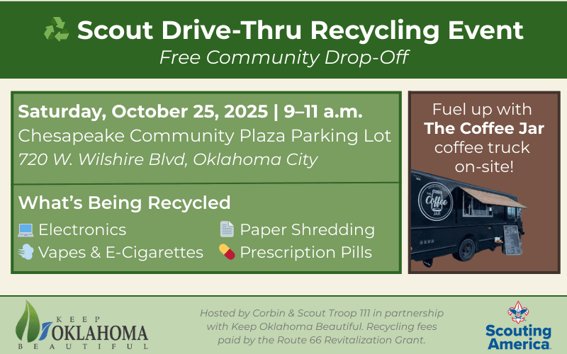 Join us for a FREE community recycling event along Route 66 in OKC led by a local Scout on his journey to Eagle Scout!